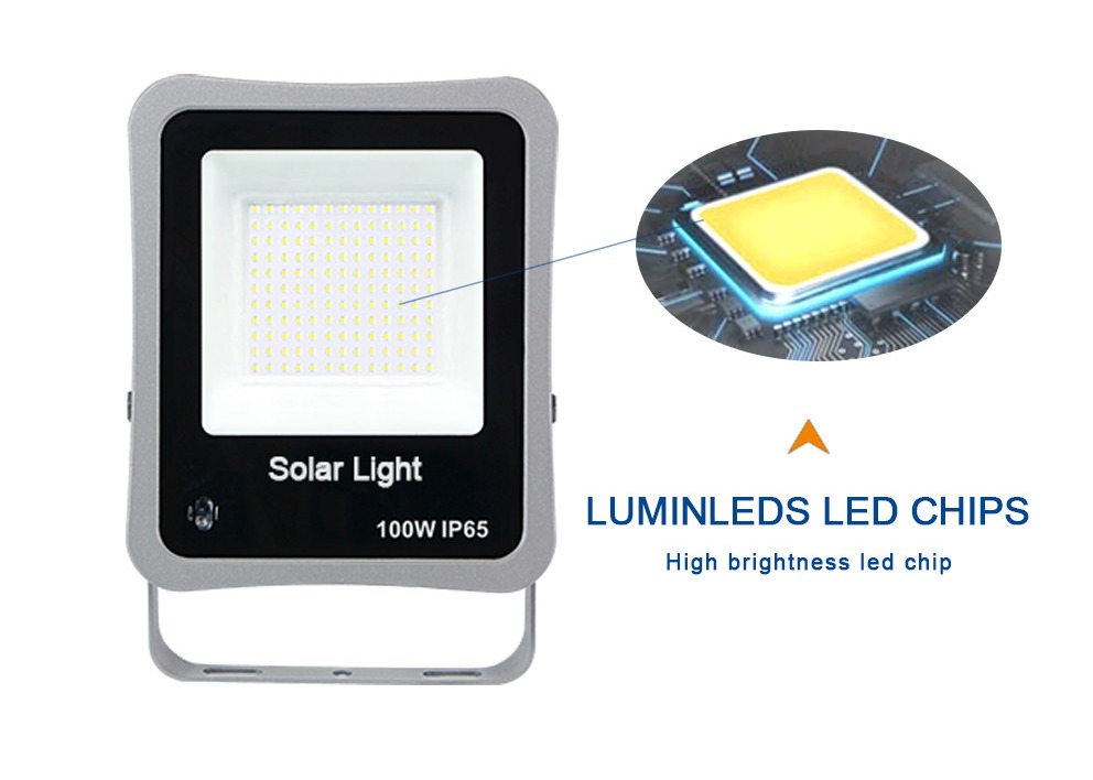 - √ 170lm/W ضوء فائق - 100W ضوء الفيضانات الشمسية عالية الضوء يدعم حتى 350 متر مربع الإضاءة، مثل 4 إلى 5 وحدات إضاءة ملعب كرة السلة، 11 وحدة إضاءة نصف ملعب كرة القدم.